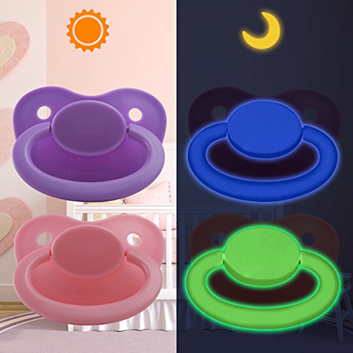 -. Binding : Baby Product -. Brand : Littleforbig -. Color : Pink -. Feature : Night glow pacifier shield button and handle. Easy to find in the dark. / True adult sized pacifier. Adult sized both teat and extra large shield. TEAT SIZE: 2 inch long x 1.2 inch wide. PACIFIER SHIELD SIZE: 2.6 inch wide x 1.9 inch tall. / High quality soft, natural silicone nipple. BPA, and latex free - see details in product descriptions below. / Adult Baby Diaper Lover Use - Reported to increse cuteness; calms and satisfies sucking urge. / Raver and rave events use - protect teeth and gum with adult sized teat. -. Label : Littleforbig -. Manufacturer : Littleforbig -. Model : LA01-LB-P31-NS201 -. MPN : LA01-LB-P31-NS201 -. PartNumber : LA01-LB-P31-NS201 -. ProductGroup : Baby Product -. ProductTypeName : BABY_PRODUCT -. Publisher : Littleforbig -. Studio : Littleforbig -. Title : Littleforbig Adult Sized Pacifier Dummy for Adult Baby ABDL - Night Glow Pink and Purple