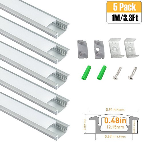 LightingWill 5-Pack 3.3ft/1M 9x23mm Silver U-Shape Internal Width 12mm LED Aluminum Channel System with Cover, End Caps and Mounting Clips Aluminum Extrusion for LED Strip Light Installations-U01S5