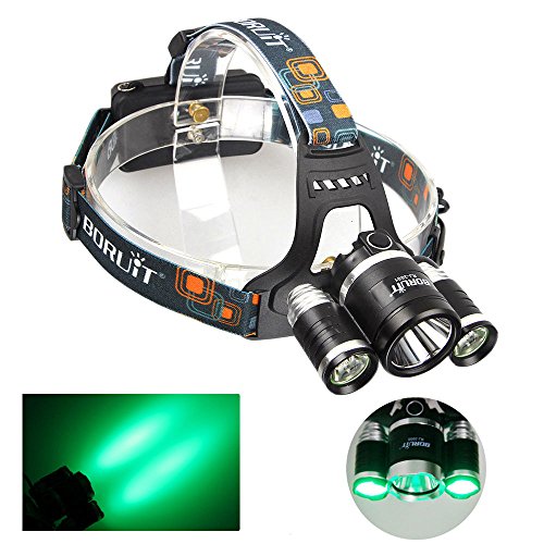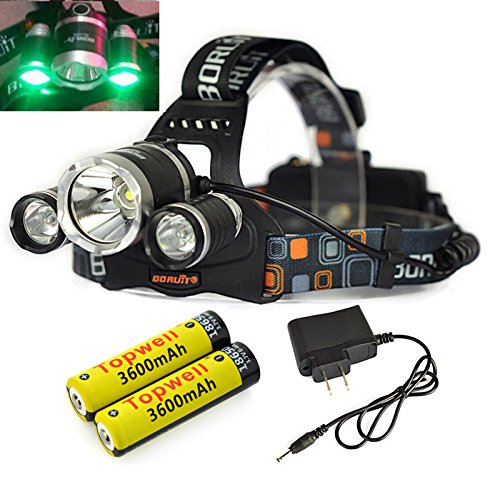 Topwell® Green Color Shooting Headlamps Light Tactical 5000LM 3 x CREE XM-L T6 +2 x Green R5 LED Head Headlight Torch Lamp GREEN Lights Headlamps for Hunting Night Fishing with 2 x 18650 3600 Mah Rechargeable Battery and Charger