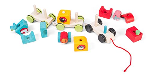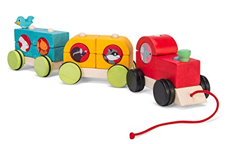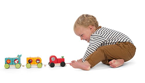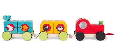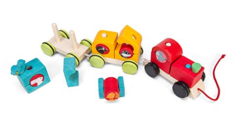 All aboard the wooden ' woodland express' train. A three carriage train with 16 pieces to sort and stack including 5 woodland passengers. Mix and match the shapes & coloured to build the pull along train. Made of solid wood ethically made from sustainable legal wood. Safe: water based paints. Tested for children from 12 months. Ideal for children aged 1- 3 years old. Part of the 'PETILOU' collection from Le Toy Van