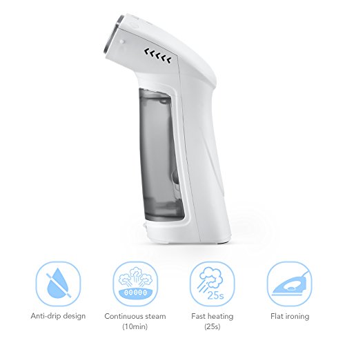 -. Feature : HIGH-PRESSURE STEAM & CONTINUOUS FLOW: Heats up in just 25 seconds and produces high-pressure steam through its 5-hole plate, lasting for around 10 minutes; quickly softens fabrics and removes wrinkles and odors; an essential gadget for students, office workers and anyone who needs a portable steamer / HANDHELD & PORTABLE: Simply plug in and use without an ironing board; light weight and ergonomic design for simple one-handed operation; can easily fit into any item of lage or backpack; great for travel, business trips and more / VERTICAL & HORIZONTAL STEAMING: 304 stainless steel steam plate combines 2-in-1 vertical and horizontal steaming functions; helps you to achieve results as good as a household iron; 850 W operation helps to quickly smooth fabric wrinkles without causing damage, and is even safe for refined fabrics like silk / TOUCH CONTROLLED & LEAKPROOF: Touch control button avoids water and electricity leaks for ultimate safety; runs on an electric water pump; the unit will automatically shut off to protect itself when the water runs out; 3.8 oz water reservoir is large enough for your daily needs, easy to detach and won't leak; transparent design to clearly view water levels / VERSATILE & EFFORTLESS: Includes a brush attachment for a more effective steamer; sanitizes bed linens, clothing, toys, sofas, carpets and drapes; lifts dirt and hair from fabrics; we provide a 90-day returns policy and a 12-month warranty from the date of your purchase
