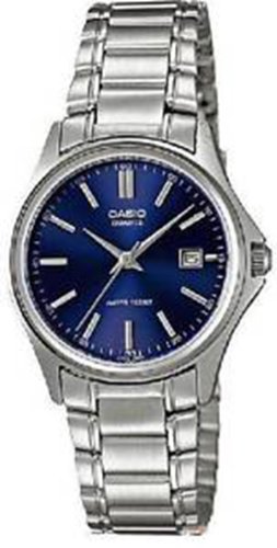 Brand, Seller, or Collection Name:Casio Model number:EAW-LTP-1183A-2A Part Number:LTP-1183A-2A Item Shape:Round Dial window material type:Mineral Display Type:Analog Clasp:Fold over clasp Case material:Stainless steel Case diameter:37 millimeters Case Thickness:10 millimeters Band Material:Stainless steel Band length:Women's Standard Band width:17 millimeters Band Color:Silver Dial color:Blue Calendar:Date Special features:Luminous Movement:Quartz Water resistant depth:30 Meters