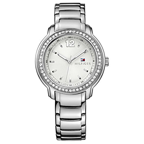 Dress watch, Japanese quartz movement, Luminescent silver-tone hands, Silver-tone sweep seconds, Silver-tone Arabic twelve with white accents, Silver-tone markers, Black Arabic numbers and indices form minute track, Silver-tone sunray dial with red/white/navy flag logo, Adjustable polished silver-tone stainless steel bracelet with push-button-clasp, Polished silver-tone stainless steel bezel with crystals, Large polished silver-tone stainless steel round case, Stainless steel crown, Stainless steel caseback, Mineral crystal, 3 ATM (30 meters/100 feet water resistant)Feature