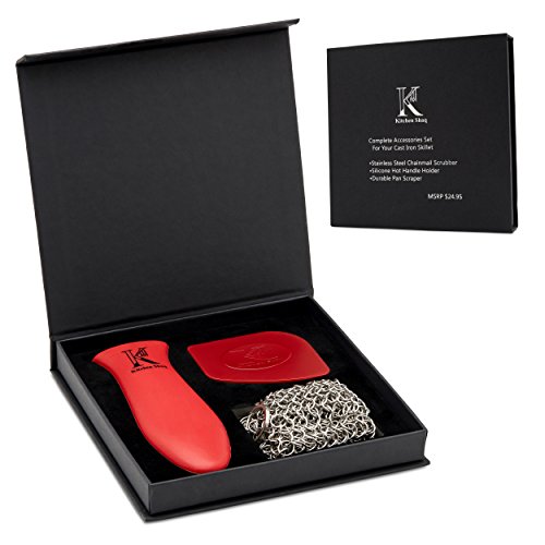 -. Feature : 6" by 8" chainmail scrubber, for cleaning cast iron cookware. Perfectly shaped to fit nicely in your hands, and can be easily stored or packed up for travel / Antibacterial- A safe way to clean your cast iron cookware. It will not have a buildup of toxic bacteria and harmful germs normally lurking in your sponges and scrubbers. Also cleans easily with just mild soap, or can be thrown in dishwasher. / Powerful - For heavy duty cookware, you need something equally powerful to combat the tough greese and grime. A Kitchen Shaq chainmail scrubber will get th job done! / Comfortable- Powers through grease, but gentle on your hands. The Kitchen Shaq chainmail scrubber is designed to sit comfortably in your hands while you scrub. It will not poke or scratch your skin like other metal scrubbers. / Bonus Silicone Hot Handle Holder- Protect your hands from the heat while you cook with this easy to slide on pot handle holder. It's comfortable on the outside, and features internal ribbing for a secure and stable grip. Please note that the handle is dishwasher safe, but should be removed before being placed in a hot oven.