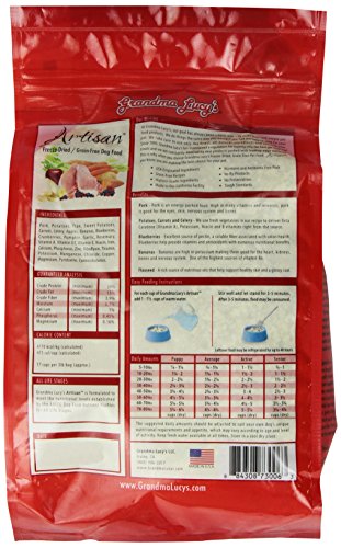 -. Feature : 3lbs bag contains USDA Pork, Potatoes, Flax, Sweet Potatoes, Carrots, Celery, Apples, Bananas, Blueberries, Cranberries, Pumpkin, Garlic, Vitamins and Minerals / 87% of our ingredients are sourced in the USA with NO ingredients from China / Made in our very own Family Owned and Operated Freeze Drying Facility in Southern California / For each cup of Grandma Lucy's add 1-2 cups of warm water, mix and serve, Ready in 3 minutes