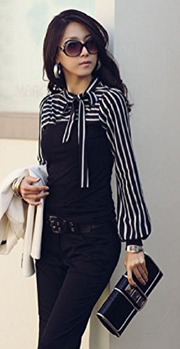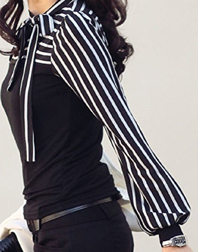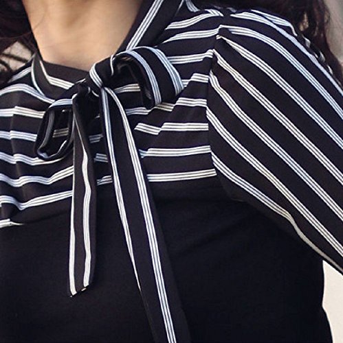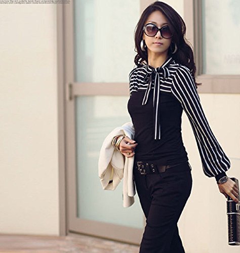 -. Feature : 切り替え風のボーダー柄のトップスです。スタイリッシュなデザインですが首元のリボンとふんわりとした袖口が女性らしいシルエットを醸し出してくれます。きれいめコーデにも可愛らしいコーデにもあう万能なトップスになっております。 / さらさらとした着心地で通気性も良く長時間着ても負担にならない柔らかい素材でできている機能的なトップスになっておりますのでカッチリとした服は苦手という方にも楽ちんにオシャレを楽しむことができます。 / シンプルなデザインとなっておりますので飽きが来ず来年、再来年と長く愛用していただけます。お気に入りの一枚になること間違いなしです。上品なデザインになっておりますのでお呼ばれやお食事会、入学式・発表会・卒業式・結婚式等のフォーマルシーンやセレモニーシーン等にも大活躍をしてくれます。 / カラーはブラックとホワイトの2色からで、サイズはS、M、L、XL、2XLと小さいサイズから大きいサイズまで揃えてありますのでご自身にあったサイズをお選びくださいませ。ブラックはシックで大人っぽい印象に。ホワイトは上品で可愛らしい印象を与えてくれます。※海外品のため小さめのお作りになっております。普段着ているサイズより2サイズほど大きいものをおすすめいたします。細身の方も普段着ているサイズより1サイズ上をおすすめいたします。 / 切り替え風のトップスになっておりますので1枚でオシャレが完成する優れものになっております。デニムと合わせてカジュアルに、スキニーパンツと合わせてキレイ目に、ジャケットやコートと合わせてフォーマルに、フレアスカートと合わせガーリーに。どんな種類の服にも着こなすことができる着回し抜群のアイテムになっております。ボーダー柄ですのでマリンスタイルにもおすすめです。