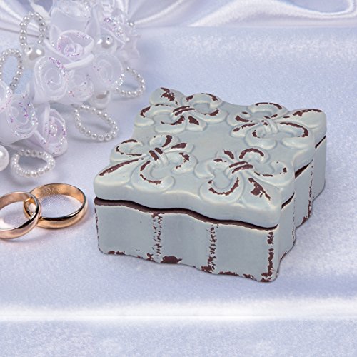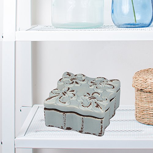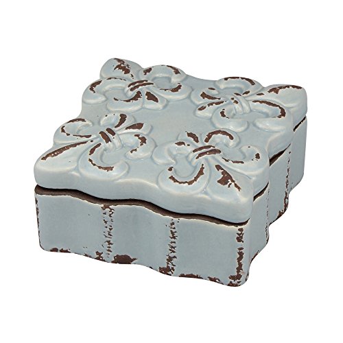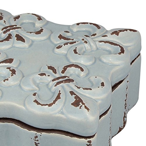 - This ceramic keepsake box features a worn pale blue finish and a decorative fleur de lis design on the removable lid giving a vintage feel