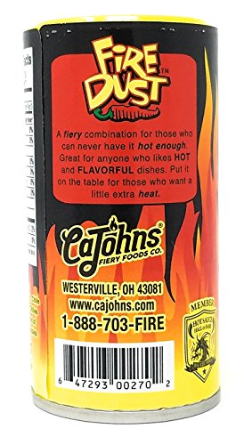 -. Binding : Misc. -. Brand : CaJohns -. EAN : 0647293002702 -. Feature : You will receive (1) 2.5 oz bottle of Cajohns Fire Dust spice blend / Great way to add heat to your favorite dish / Great on pizza and popcorn / Very flavorful spice blend to liven up any food / No sugar, salt or MSG -. IsAdultProduct : 0 -. Label : Cajohns -. Manufacturer : Cajohns -. PackageQuantity : 1 -. ProductGroup : Grocery -. ProductTypeName : GROCERY -. Publisher : Cajohns -. Studio : Cajohns -. Title : Cajohns Fire Dust Spice Blend - 2.5 oz. -. UPC : 647293002702