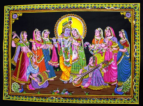 A Beautiful Cotton Wall Hanging Potraying Lord Krishna & Radha Playing with Gopis & Friends. The Tapestry Symbolizes The Purest Form of Indian Transcendental Love. A Spiritual Wall Decor Item for living rooms to Bring Back Love & Happiness in Married Life. It measures approximately 30" High X 43" Wide. The item will be shipped via Regd Airmail India Post Service directly from India within 24-48hrs after receiving the cleared payment,the usual delivery time is 7-20 business days only. SPECIAL OFFER: For all orders above $49,the items will be shipped through Expedited Track-able Courier Service like UPS/ARAMEX/FEDEX which can deliver within 3-6 business days only. HAPPY SHOPPING..
