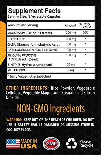 Studio : HS PRIME LLC Publisher : HS PRIME LLC Binding : Health and Beauty Product Description 5-htp l-theanine - SLEEP SUPPORT - ADVANCED BLEND 952Mg - antiaging - 2 Bottles (120 Capsules) Support Healthy Sleep: GABA has a calming, sedative effect and may be able to help naturally induce sleep by reducing nerve excitability. Study found that taking GABA helped participants fall asleep quickly, shortening the amount of time it took to fall asleep by an average of five minutes. Besides using GABA for sleep, maintaining a regular sleep schedule, limiting your caffeine intake and taking magnesium to help promote GABA function can all also encourage better sleep. Emotional health Enhancer: In addition to decreasing anxiety and regulating sleep, the GABA neurotransmitter is also thought to play a central role in emotional well-being. Research has found that people with emotional problems tend to have lower levels of GABA than those without it. Mood swings also have been shown to be improved with GABA supplementation. Focus Energy Enhancer: Increasing GABA production may result in an improvement in energy to maintain sharp focus. Short attention spans may be lengthened as increased GABA levels help with focus and concentrative ability. GABA's benefits consist of an inhibitory effect on over-excitation within the brain has a calming and soothing effect which contributes to a person's sense of well-being. Athlete Enhancer: Phellodendron along with other many ingredients in this supplement work together to help athletes rest and repair, ready to hit their workouts the next day. Recovery after the workout will be much more effective for the athlete since the ingredients aid in fight off the stresses and at the same time have calming and can support brain functions. 0