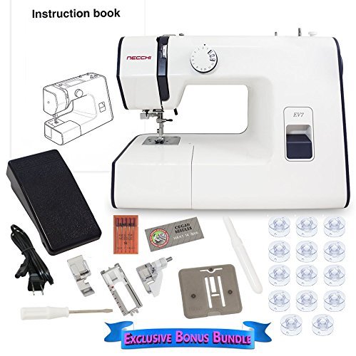 -. Binding : Office Product -. Brand : Necchi -. EAN : 0708038733586 -. Feature : Exclusive Bonus Bundle includes 0 Pack of Bobbins, Seam Ripper, Red Tip Needles (Size 14) / When you need a basic reliable sewing machine at home or on the go the Necchi EV7 fits the bill. / The Necchi EV7 mechanical sewing machine has a sturdy mechanism and 7 essential stitches plus a four-step buttonhole. / The Necchi EV7 mechanical sewing machine has a sleek design and includes useful features like a built-in needle threader, onboard storage, and easy conversion to a free arm for sewing in tight spaces. -. Label : Necchi -. Manufacturer : Necchi -. MPN : ev7-bundle -. PackageQuantity : 1 -. PartNumber : ev7-bundle -. ProductGroup : Art and Craft Supply -. ProductTypeName : ART_SUPPLIES -. Publisher : Necchi -. Studio : Necchi -. Title : Necchi EV7 Mechanical Sewing Machine with Exclusive Bonus Bundle -. UPC : 708038733586