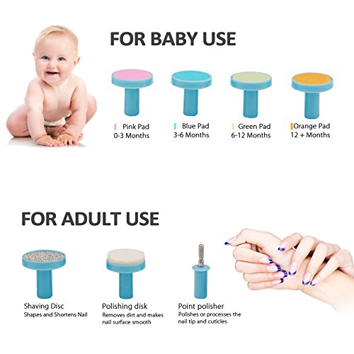 4 x Different Cushioned Filing Heads for Baby 3 x Different Accessories for Adults 1 x Electric Baby Nail Trimmer 1 x Storage and Travel Case 1 x User Manual Click 'Add to Cart' now to get the best baby nail clippers for newborns, toddlers and young children. 0