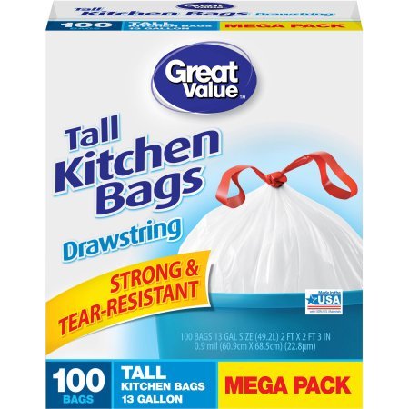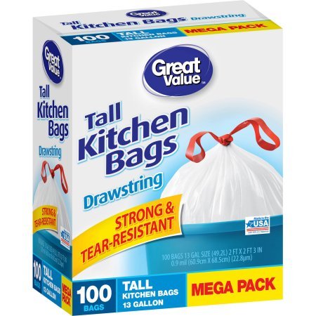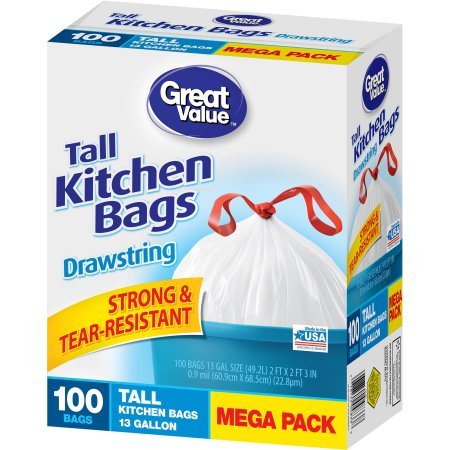 -. Title : Great Value 13 gal Tear-Resistant Tall Kitchen Bags, Mega Pack, 100ct