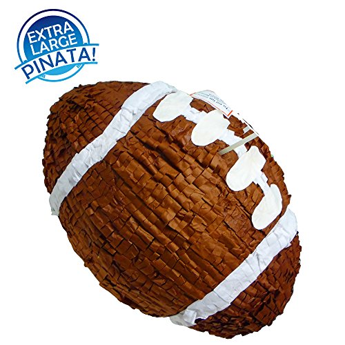 Pinata measures 24 inches high by 20 inches long by 20 inches deep. This Deluxe Football Pinata is a ideal for a boy´s football themed birthday party. Featuring a football shaped pinata with white decorations, this pinata is also a great addition to a schools sports event as decoration or to play the traditional pinata game. Pinata holds up to 3 pounds of toys and candy (sold separately).
