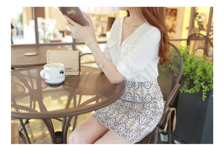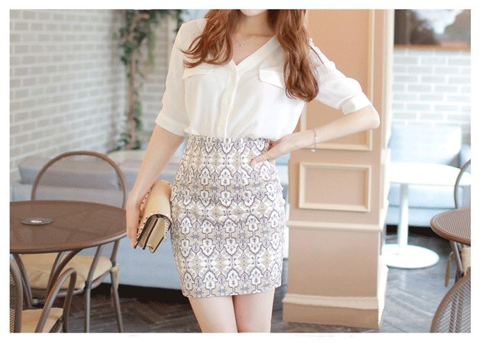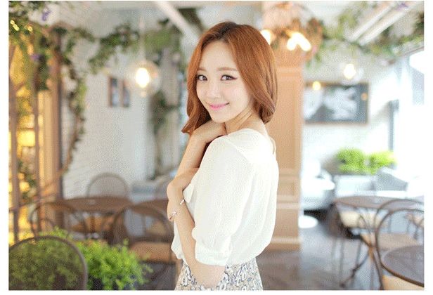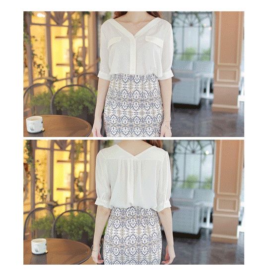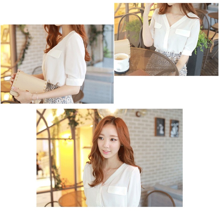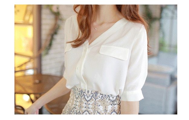Vネックとシフォン素材がフェミニンな、五分袖のノーカラーシャツです。