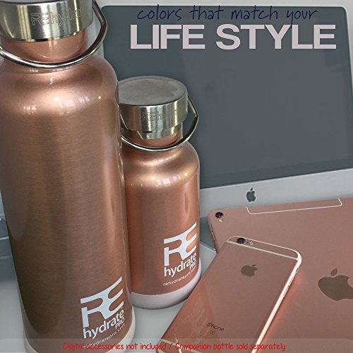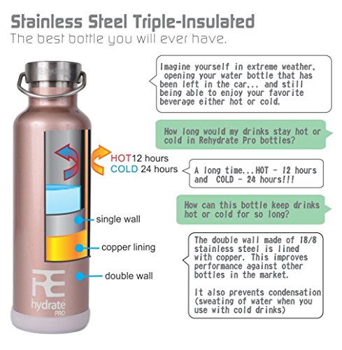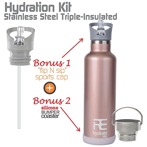 Rehydrate-Pro Double Wall (25oz) Insulated Stainless Steel Water Vacuum Bottle Flask. Best Coolest, and Hottest Drink Holder + Bonus 'Flip N Sip' Sports Cap with straw + Bumper Coaster
