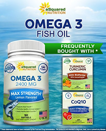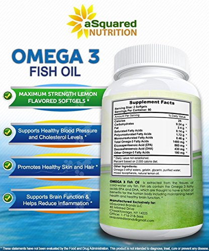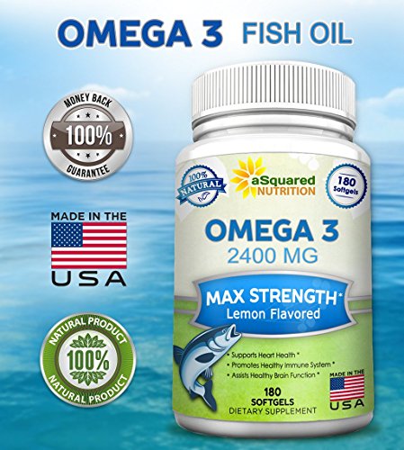 -. Binding : Health and Beauty -. Brand : aSquared Nutrition -. EAN : 0641799787545 -. Feature : BEST PREMIUM OMEGA 3 FISH OIL PILLS - This max strength (2400mg) Omega 3 delivers a high potency concentration of essential fatty acids in every serving - plus each bottle contains 180 lemon flavored, burpless, high absorption capsules! Other brands offer half for a much more expensive price! Plus, our product is backed by our best in the industry 100% MONEY BACK GUARANTEE. / HIGH QUALITY, PURITY, and POTENCY -. Our premium Omega 3 is molecularly distilled for maximal purity so that it is free of any heavy metals and toxins. Our fish oil delivers a higher concentration of DHA and EPA compared to other cheaper brand alternatives. Each serving of 2 softgels contain 860mg of EPA and 430mg of DHA! / BURPLESS LEMON FLAVOR - 100% NATURAL - Sourced from deep blue sea, our high concentration Omega 3 supplement is easily digested with a gentle lemon flavor and premium enteric coated, burp free coating which makes sure there is NO FISHY AFTERTASTE, nausea, or gastrointestinal irritation - a fantastic, everyday fish oil supplementation! / MADE IN THE USA - HIGHEST SAFETY QUALITY STANDARD - Our product is molecularly distilled and completely free from heavy metals, toxins, mercury, and other contaminants. We go the extra mile to ensure our supplements have passed extensive quality control testing before being bottle and sold - and never contain fillers, binders, or potentially harmful preservatives or GMOs.. We use only FDA regulated GMP certified manufacturing facilities in the USA. / 100% SATISFACTION GUARANTEE - each of our Omega 3 xl bottles contains 180 pills, which makes for an ultra long lasting supply! Our easy to swallow Fish Oil vitamins for men, women, and kids are ideal for joint support, heart health, nervous system function, cardiovascular health, eyesight, improved mood & focus, less daily stress, weight loss, reducing inflammation, improved bone health, cholesterol, blood pressure, colon cleansing, hair, skin, and many more benefits! -. IsAdultProduct : 0 -. Label : aSquared Brands -. LegalDisclaimer : These Statements have not been evaluated by the Food and Drug Administration. This Product is not intended to diagnose, treat, cure or prevent any disease. -. Manufacturer : aSquared Brands -. PackageQuantity : 1 -. ProductGroup : Health and Beauty -. ProductTypeName : HEALTH_PERSONAL_CARE -. Publisher : aSquared Brands -. Studio : aSquared Brands -. Title : Pure Omega 3 Fish Oil Supplement (180 Softgels Lemon Flavor) 2400mg Max Strength, High Potency EPA & DHA, Natural Omega-3 Fatty Acids, Burpless Liquid Capsule Pills for Brain Joints Eyes Heart Health -. UPC : 641799787545