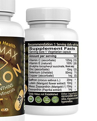 -. Title : Vision Max Advanced Vision Macula Health Supplements Saffron + Lutein, Zeaxanthin Meso-Zeaxanthin, AREDS2 Vitamin Minerals | Made in U.S.A.