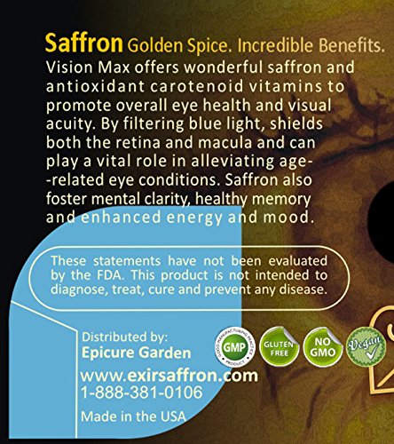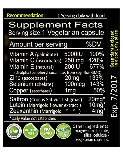 -. Feature : High potent Antioxidant Vitamin and Mineral, scientifically validated ingredients with Saffron, Lutein, Zeaxanthin, Vitamin A, E, C, Selenium, and Mineral Zinc, Copper / Nourishes and strengthens vision, eye fatigue, cardiovascular, memory, mood. Helps body's natural defenses and immune system / 100% Natural , No Artificial Colorings, No Preservatives, Non GMO, Gluten Free, Vegan / Current/former smokers: this product is Beta-carotene free / Also consider Vision Max 2020 Vision & Macular Health Supplement by Exir