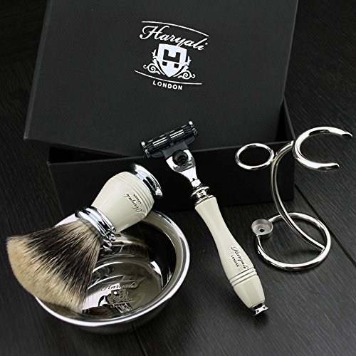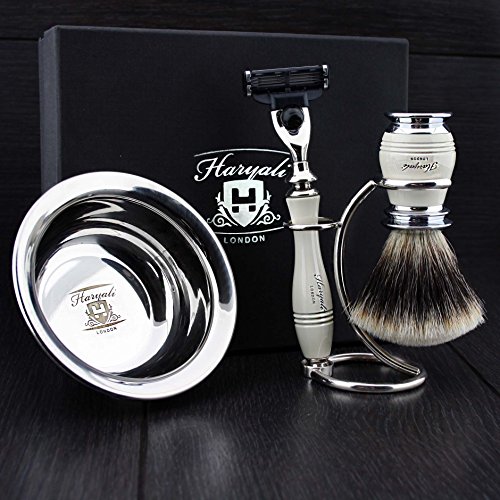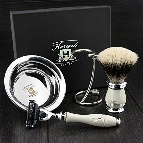 Men's Shaving Set In Ivory Colour ft Gillette Mach 3 Razor(Replaceable Head),Sliver Tip Badger Hair Brush, Dual Stand for Both Razor&Brush and Stainless...
