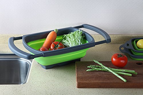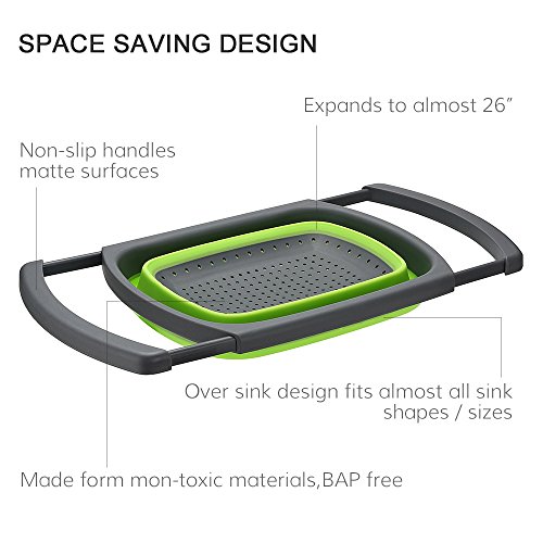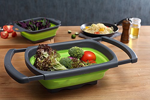 Features: Convenient Capacity--The Colander can easily hold up to 6 quarts of beans, berries, pasta, grains, fruits or vegetables. Space saving design--The food strainer length 15.5 inches and width 10 inches, Collapsed strainers is 1.6 inches high. so you can place neatly when you finished Non-Slip Handles--Go ahead and give this Colander a firm shake! The soft, comfortable handles help it stay in your hands, even when wet. Faster Draining--rounded holes draw water away from food, speeding up the straining process
