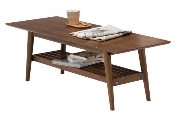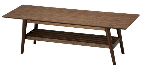ウォールナット(突板)材を使用した長方形の棚付きテーブルです。天然素材(突板)のため木目が美しく暖かみが溢れています。ミッドセンチュリー家具を彷彿とさせる、味わいのあるローテーブルです。棚板には、新聞やリモコンなどを置くことができ、 テーブル周りをスッキリできます。 |