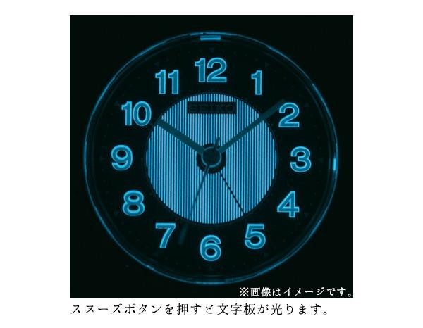 | 使う場所を選ばない、小ぶりなサイズの目ざまし時計です。スヌーズボタンを押すと文字板全体が光ります。 |
