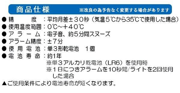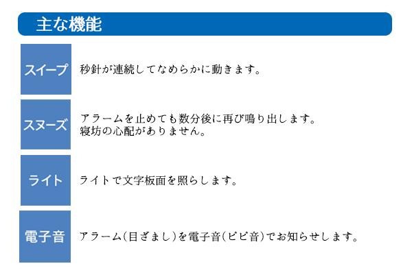 使う場所を選ばない、小ぶりなサイズの目ざまし時計です。スヌーズボタンを押すと文字板全体が光ります。 |