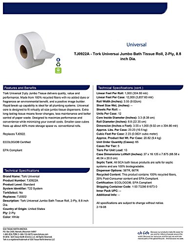Tork Universal TJ0922A Jumbo Bath Tissue Roll, 2-Ply, 8.8" Dia., 3.55" Width x 1,000' Length, White (Case of 12 Rolls, 1,000 per Roll, 12,000 Feet)