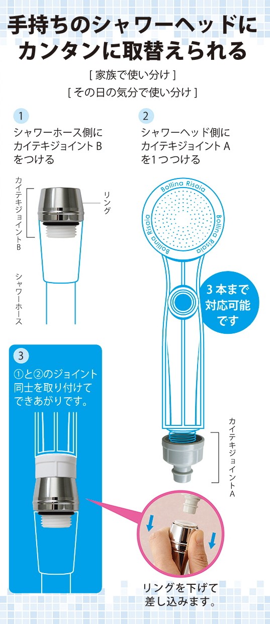 手持ちのシャワーヘッドにカンタンに取替えられる マイシャワーハンガーとカイテキジョイントのセット