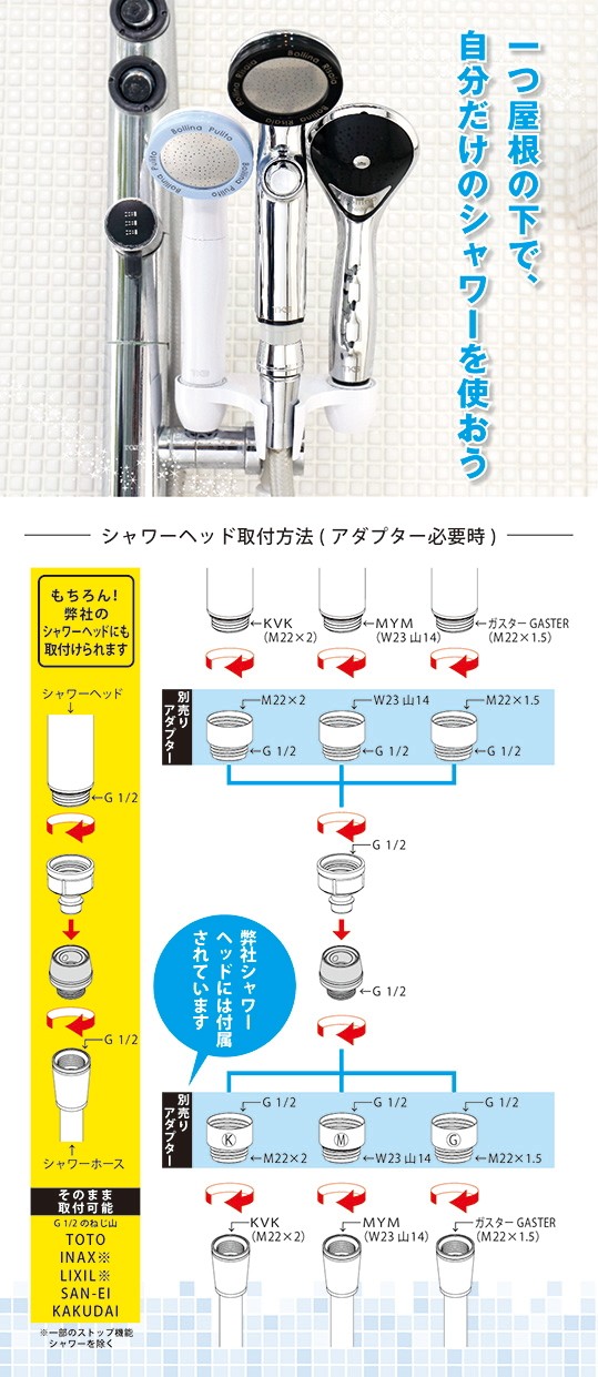 手持ちのシャワーヘッドにカンタンに取替えられる