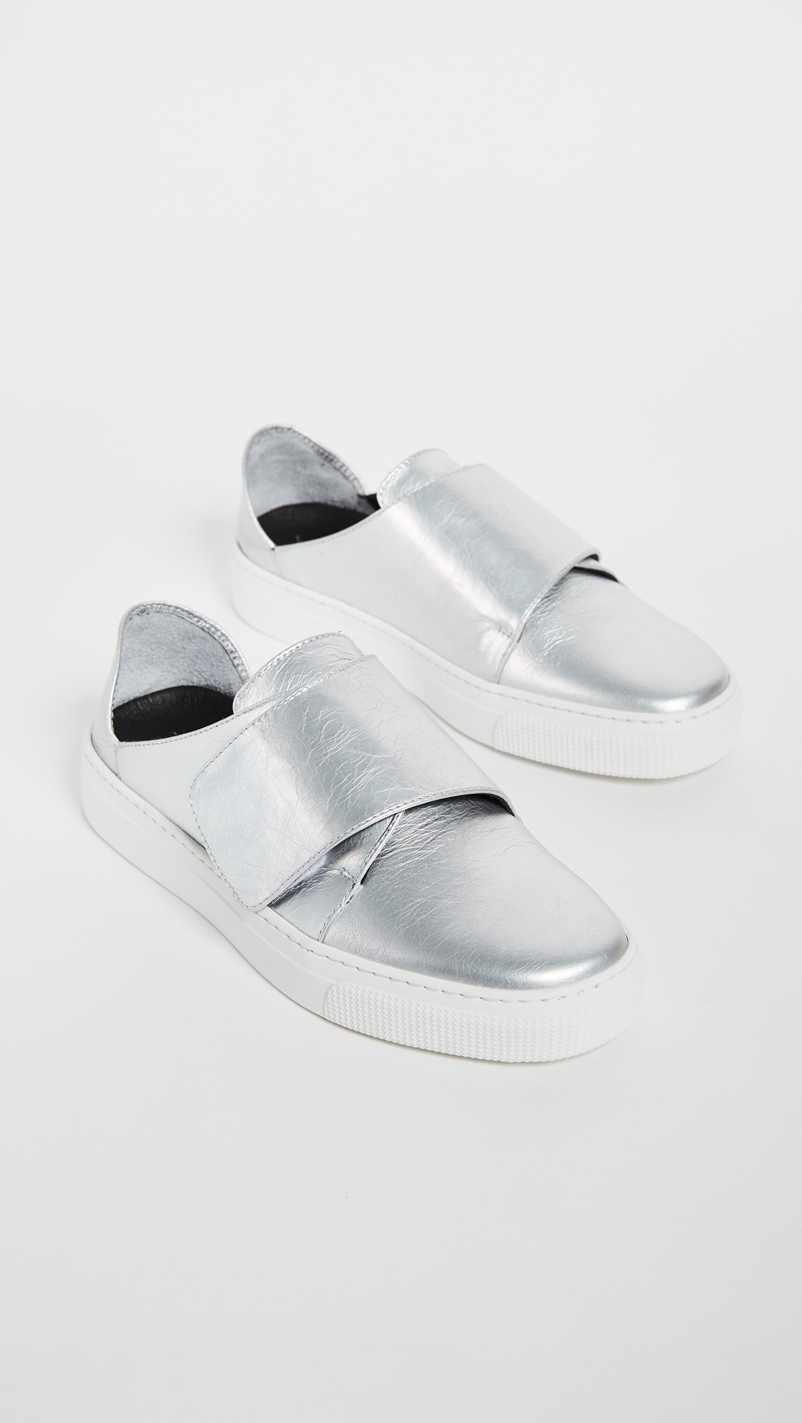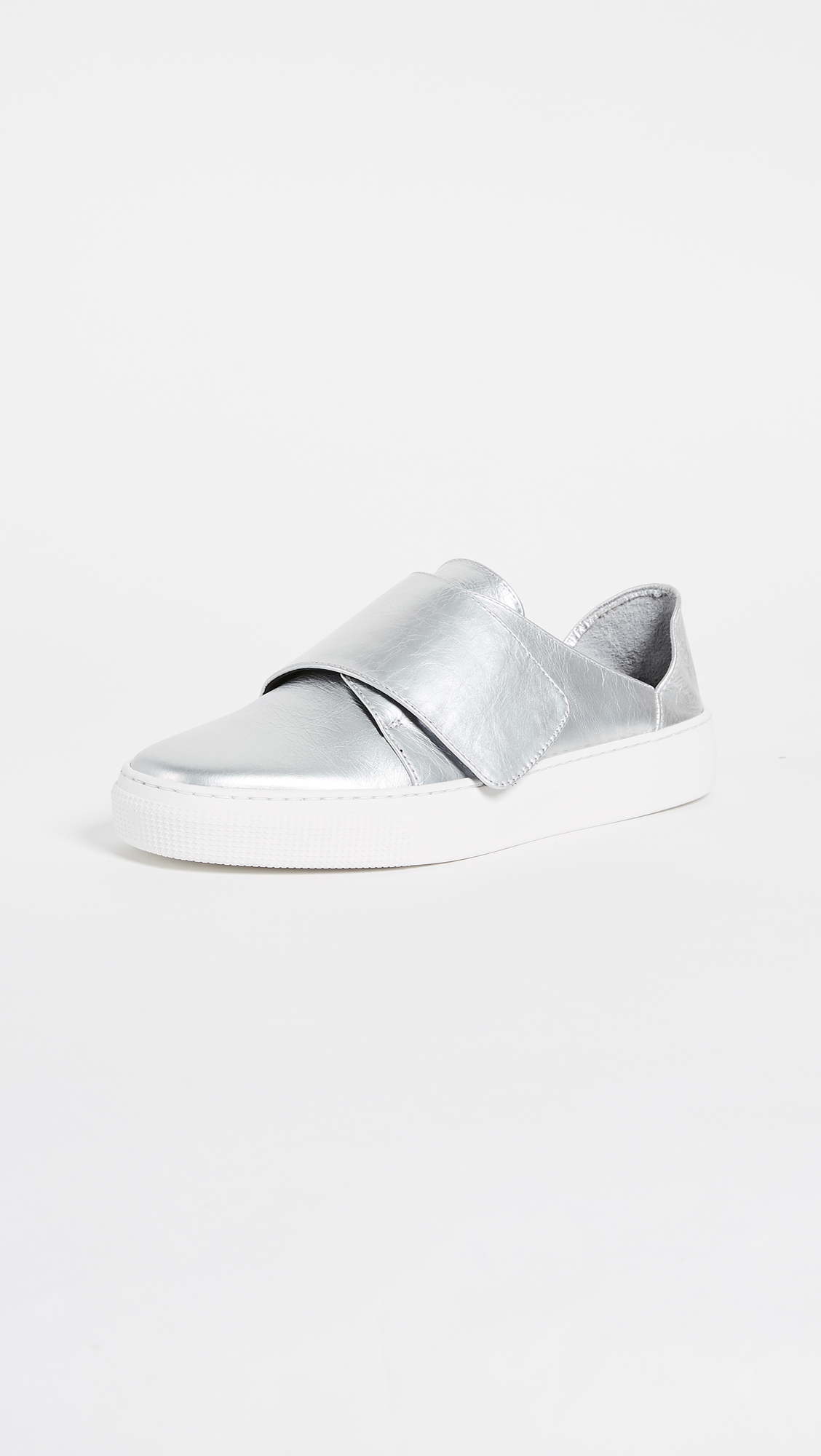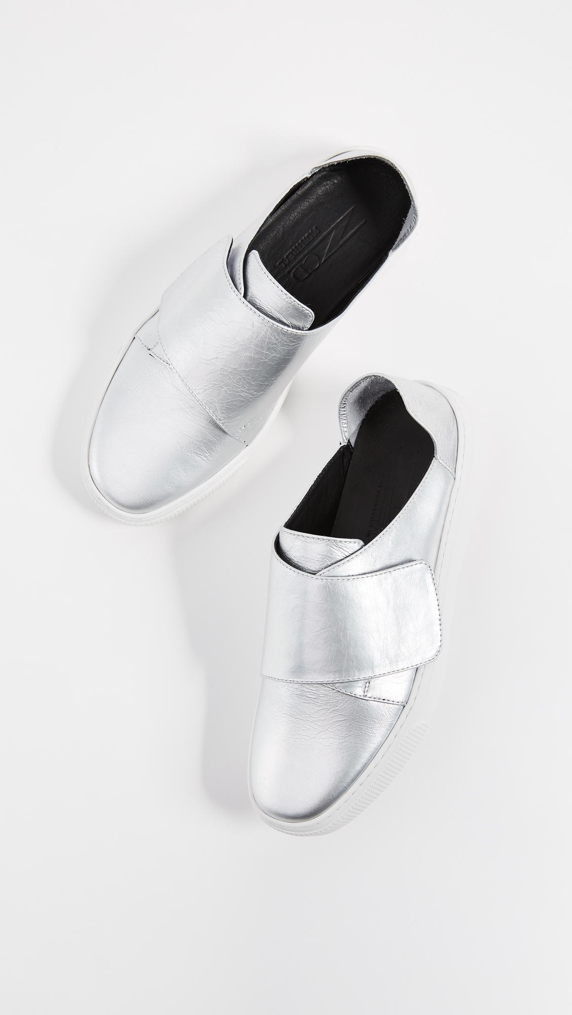 A wide Velcro strap covers the top of these bold, metallic leather ZCD Montreal sneakers. A malleable heel cap can be worn down for easy, slide-on style. Rubber sole.