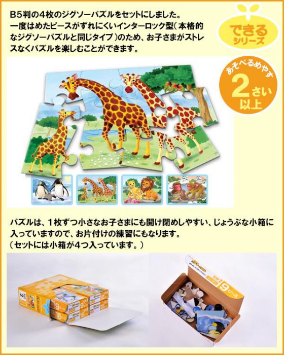 遊びながら学習につながる集中力と作業力を伸ばす、「スモールステップ」方式のジグソーパズルのセット。このSTEP2は、9ピースのパズルから20ピースのパズルまで、合計4枚のジグソーパズルがセットされています。少しずつピースを増やしていくことで、パズルを完成させる達成感を味わいながら集中力と作業力を高めていけます。 |