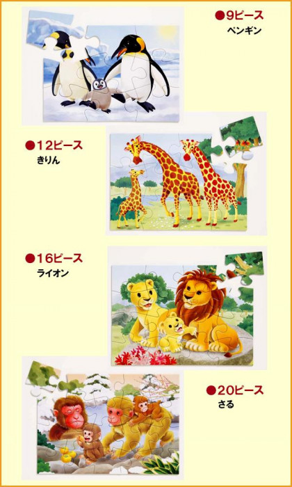 | 遊びながら学習につながる集中力と作業力を伸ばす、「スモールステップ」方式のジグソーパズルのセット。このSTEP2は、9ピースのパズルから20ピースのパズルまで、合計4枚のジグソーパズルがセットされています。少しずつピースを増やしていくことで、パズルを完成させる達成感を味わいながら集中力と作業力を高めていけます。 |
