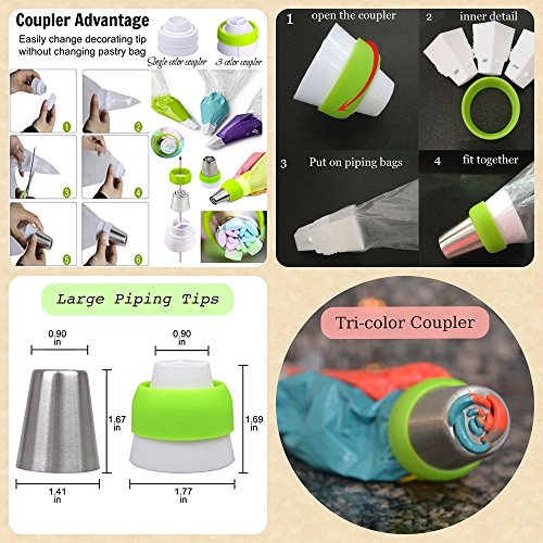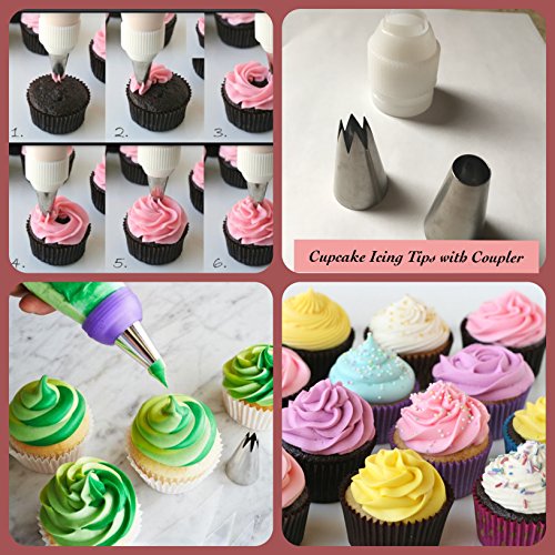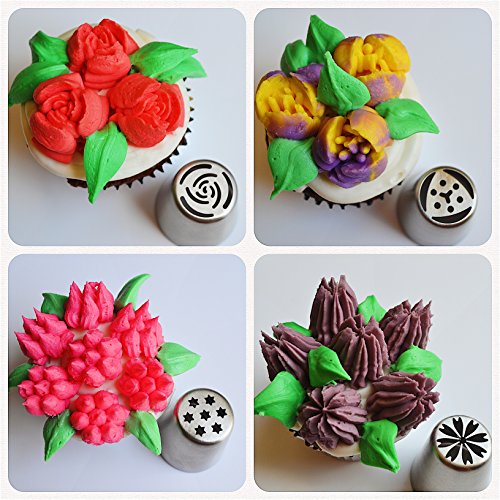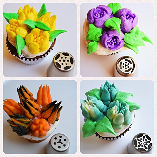 EVERYTHING YOU NEED FOR DECORATING BEAUTIFUL CAKES and CUPCAKES -The kit includes 8 large high quality floral Russian piping tips, 2 Cupcakes decorating icing tips, 1 leaf tip, 1 coupler for both the leaf and the two cupcake icing tips, 1 Tri-color coupler, 1 Single-color coupler, 10 bonus disposable pastry bags