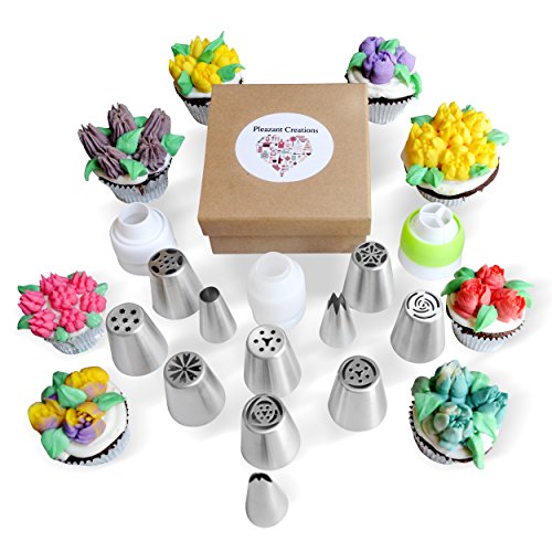 Pleazant Creations Frosting Tips Set of 24 Pcs-8 Russian Piping Tips,2 Cupcake Icing Tips,1 Leaf Nozzle,3 Couplers, l0 Disposable pastry Bags Baking Decorating Supply for Cakes + Instructional Video