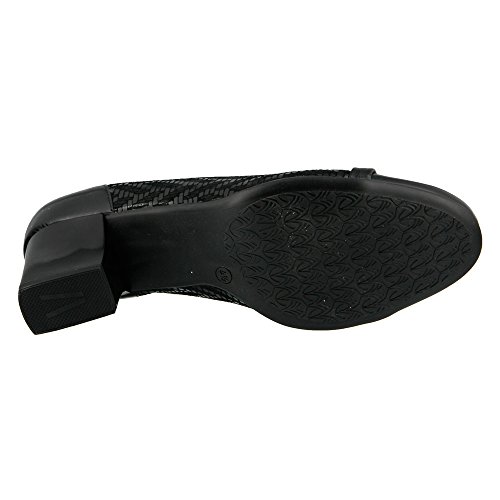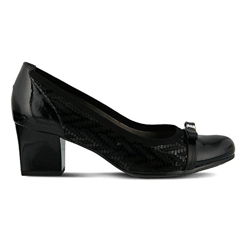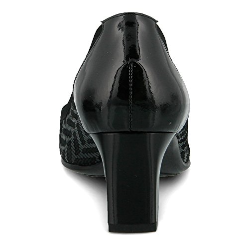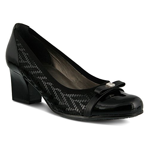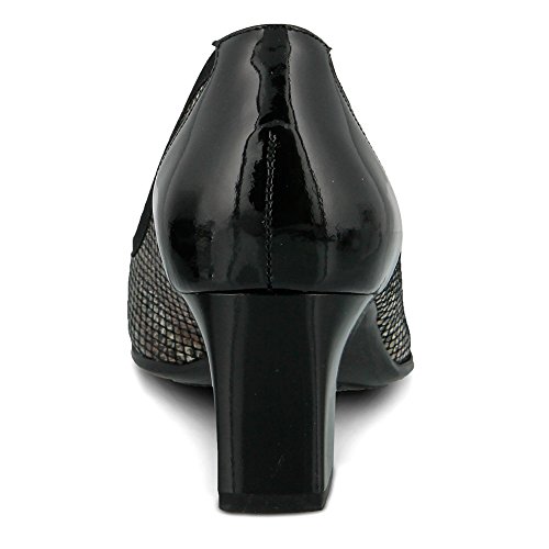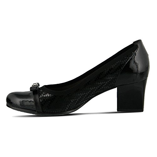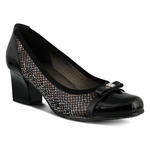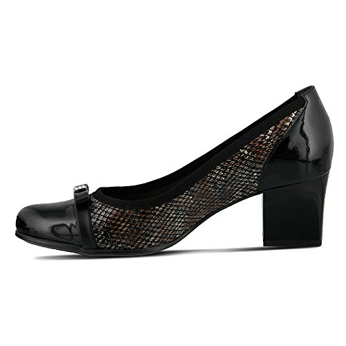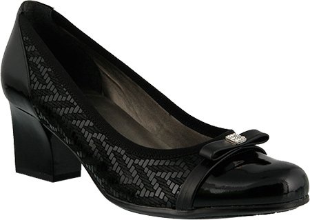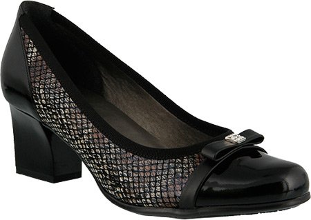 Product DescriptionWide fit, snake printed suede and patent leather pump with patent leather heel and feminine bow detail.0