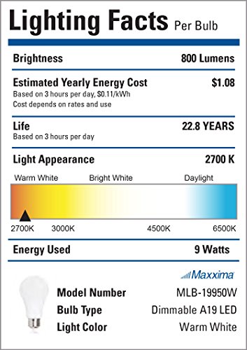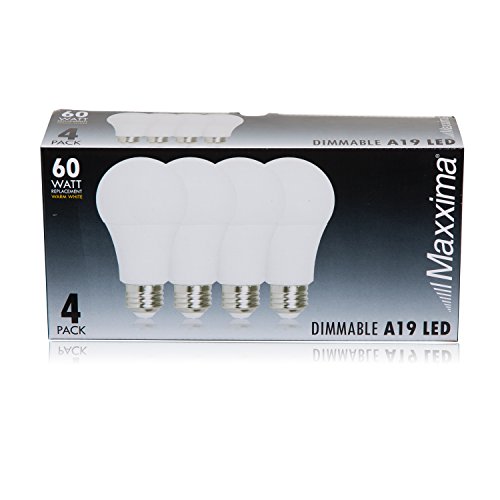 Maxxima Dimmable A19 LED 800 Lumens 60 Watt Equivalent Warm White 2700K 9 Watt Light Bulb Energy Star Rated (4 Pack)