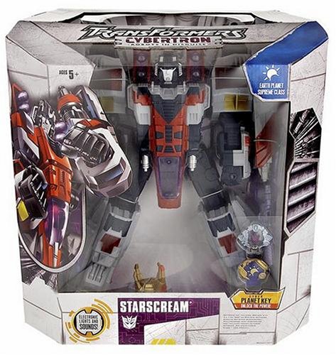 -. Binding : Toy -. Brand : Hasbro -. EAN : 0653569064251 -. Feature : Change from high-powered DECEPTICON warlord to futuristic jet and back again! / Missile rack featuring real lights and electronic rocket blast sounds! / Insert one of two CYBER PLANET KEY to reveal awesome secret weapons: an arm-mounted null-ray cannon with real firing projectile and Energon blade! / Crown him as a royal threat to peace with the DECEPTICON crown of leadership! -. IsAdultProduct : 0 -. Label : Hasbro -. LegalDisclaimer : Change from high-powered DECEPTICON warlord to futuristic jet and back again!Missile rack featuring real lights and electronic rocket blast sounds!Insert one of two CYBER PLANET KEY to reveal awesome secret weapons: an arm-mounted null-ray cannon with real firing projectile and Energon blade!Crown him as a royal threat to peace with the DECEPTICON crown of leadership! -. Manufacturer : Hasbro -. Model : 80926 -. MPN : 080310B -. PackageQuantity : 1 -. PartNumber : 080310B -. ProductGroup : Toy -. ProductTypeName : TOYS_AND_GAMES -. Publisher : Hasbro -. ReleaseDate : 2006-09-12 -. Studio : Hasbro -. Title : Transformers Cybertron Starscream -. UPC : 653569064251