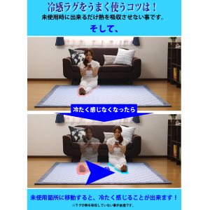 冷感ラグをうまく使うコツは、未使用時に熱をラグに吸収させないことと、少しずつ移動することにより、ひんやりした感触を体感できることです。