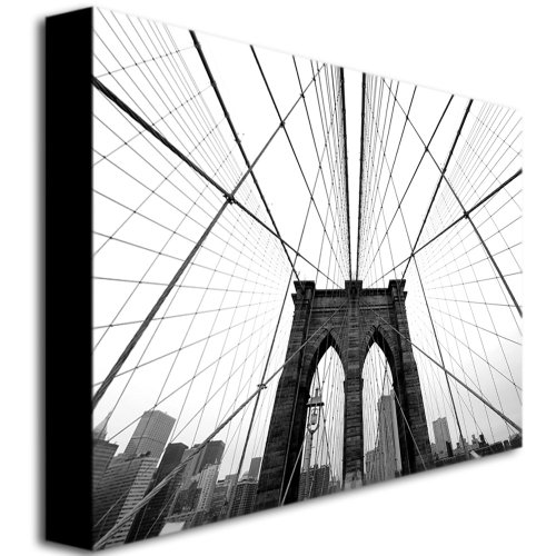 This ready to hang, gallery-wrapped art piece features a photograph of the Brooklyn Bridge. Nina Papiorek's work is as multilateral as her interests and motives. What combines all her works is the aim to catch a special moment with her camera, which has nothing to do with a particular technique or scenery, but a feeling she likes to capture. Nina's passion is black & white photography. In her opinion a photograph always lives from a unique moment, from an expressive face or from a story written in an observer's mind. Technique and equipment only play a secondary role. Nina finds her protagonists and motives on travels, on the street, in normal life- the urban way, the chaotic city, lonely districts, just to name a few. Giclee (jee-clay) is an advanced printmaking process for creating high quality fine art reproductions. The attainable excellence that Giclee printmaking affords makes the reproduction virtually indistinguishable from the original piece. The result is wide acceptance of Giclee by galleries, museums, and private collectors. Gallery wrap is a method of stretching an artist's canvas so that the canvas wraps around the sides and is secured a hidden, wooden frame. This method of stretching and preparing a canvas allows for a frameless presentation of the finished painting.Feature