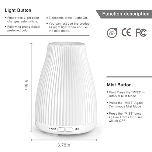 Feature: 1.Auto shut off when water runs out. 2. There are 8 Color Changing Lights. Press the "LIGHT" button once to turn on the light, and light cycles automatically. During light cycle, press the key to set preferred color. In any time, press the "LIGHT" button for three seconds, the light goes out. 3.Two mist mode - The first press of "MIST" button in short time, the product beeps and aroma diffuser work as the interval mist mode (work 30 seconds, stop 30 seconds). When press the "MIST" button again, the product beeps once, and aroma diffuser run as continuous work mode.