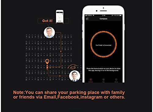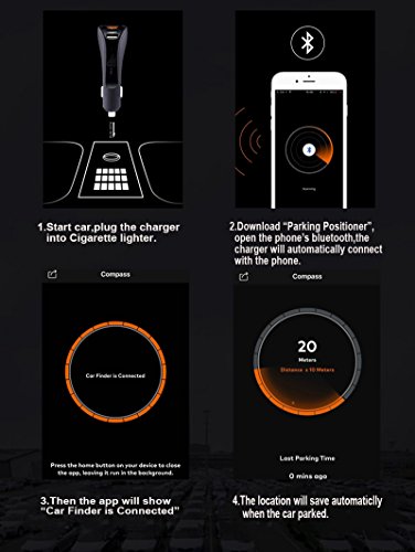 How to Use: 1.Download APP by scan QR code on package or search "Parking Positioner" in Apple Store or Google Play. 2. Start the car, insert the Smart Quick Car Charger into Cigarette Lighter. 3. Turn on your phone Bluetooth, the app will automatically connect with the phone. Then the app will show "Car Finder is Connected" 4. Park Find Car: Location saved successfully when your car is shutting down just open the App and it will guide you find your car.(Open your map App sometimes needed)