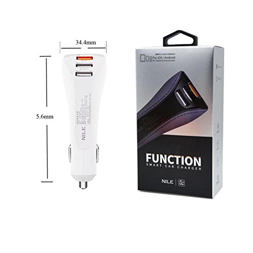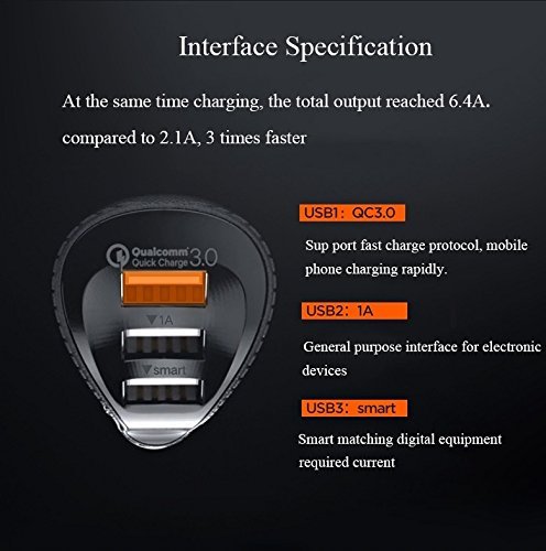 The third generation of smart chip Photograph reminder when no signal or weak signal Qualcomm Quick Charge 3.0 3 USB Charging Ports Input : DC 12-24V/3.2A Total Output : DC 5V/ 6.4A Output USB Smart : DC 5V/ 2.4A Output USB-II : DC 5V/ 1A Output USB-QC3.0 : DC 3.6-6.5V/ 3A, DC 6.5-9V/ 2A, DC 9-12V/ 1.5A Size: 3.76* 1.35 in (95.6* 34.4 mm) External Meterial: Leather