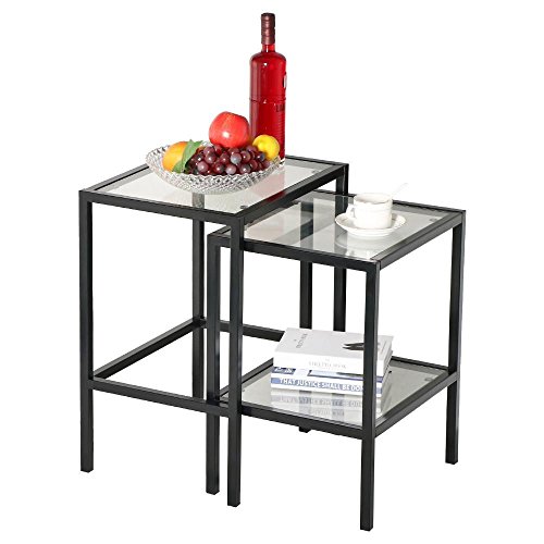 -. Brand : Yaheetech -. Color : Black -. EAN : 1007230233696 -. Feature : Sold in a set of 2pcs metal glass nesting tables / The top and the lower shelf built with 5mm thick clear glass / Special Function: built with good stability and greater flexibility to move / Space saving design: built in compact size / Used as a lamp table, book shelf, decorative display table and phone table -. Label : Yaheetech -. Manufacturer : Yaheetech -. MPN : YT-00026169 -. PartNumber : YT-00026169 -. ProductGroup : Furniture -. ProductTypeName : HOME_FURNITURE_AND_DECOR -. Publisher : Yaheetech -. Studio : Yaheetech -. Title : Yaheetech Pair of Modern Glass Nesting Tables Black Metal Frame with Storage Shelf (Set of 2)