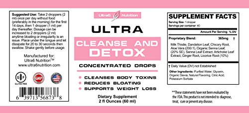 -. Feature : 100% MONEY BACK GUARANTEE (TRY RISK FREE) - Your satisfaction has no time limit and is 100 percent guaranteed. If you are not completely satisfied, return the Ultra Cleanse and Detox drops to us for a full and prompt refund. / HELPS LIVER CLEANSE BODY OF TOXINS -- Our Ultra Cleanse and Detox drops were specifically formulated to help the liver cleanse the body of toxins and impurities. This in turn helps strengthen, support and even repair the liver. / REDUCES BLOATING -- Ultra Cleanse and Detox drops were specifically formulated with key herbs and extracts that have shown real results in reducing bloating, supporting better digestion and preparing the body for healthy sustainable weight loss. / EASY TO TAKE BIOAVAILABLE SOLUTION -- Our Liquid Concentrated delivery system maximizes the amount of Milk Thistle, Organic Senna Leaf and other herbs in our formula to give your body the full cleanse and detox effect unlike pills that mostly pass through your system. / MADE IN USA AND FREE TELEPHONE SUPPORT - Our Ultra Cleanse and Detox Drops are made in the USA by an FDA Inspected and GMP Certified Facility. Free telephone support for questions and guidance with product usage or any other needs you may have.