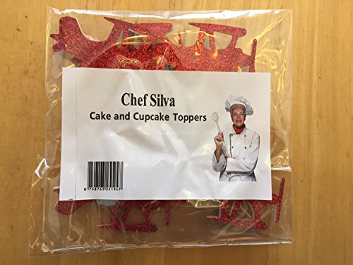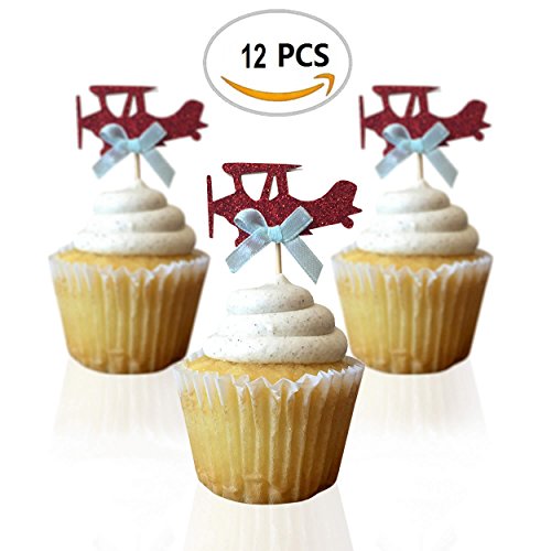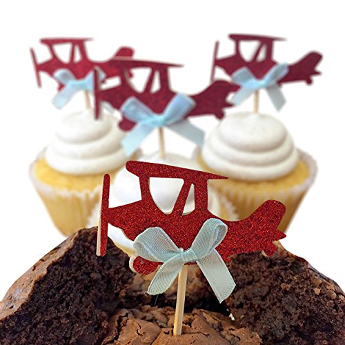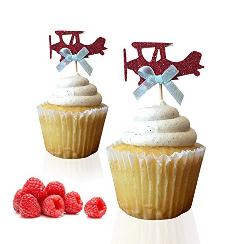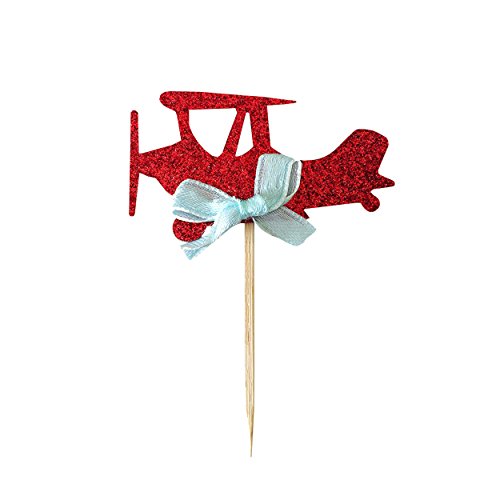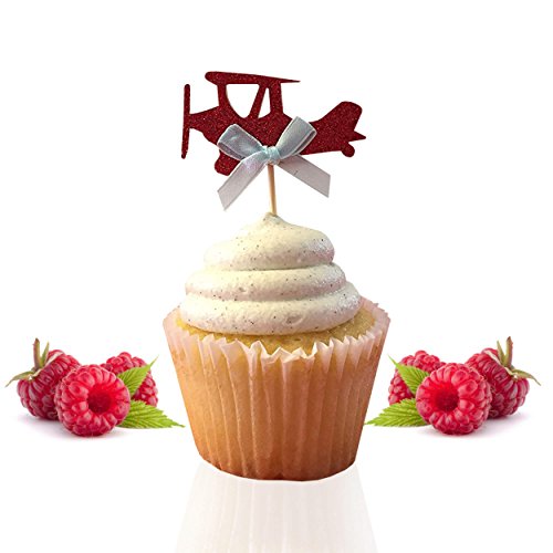 Airplane cupcake toppers - double sided for 1st birthday party boy baby shower cake decorations graduation anniversary wedding child bake events red glitter vintage planes unisex toy fiesta 12 CT