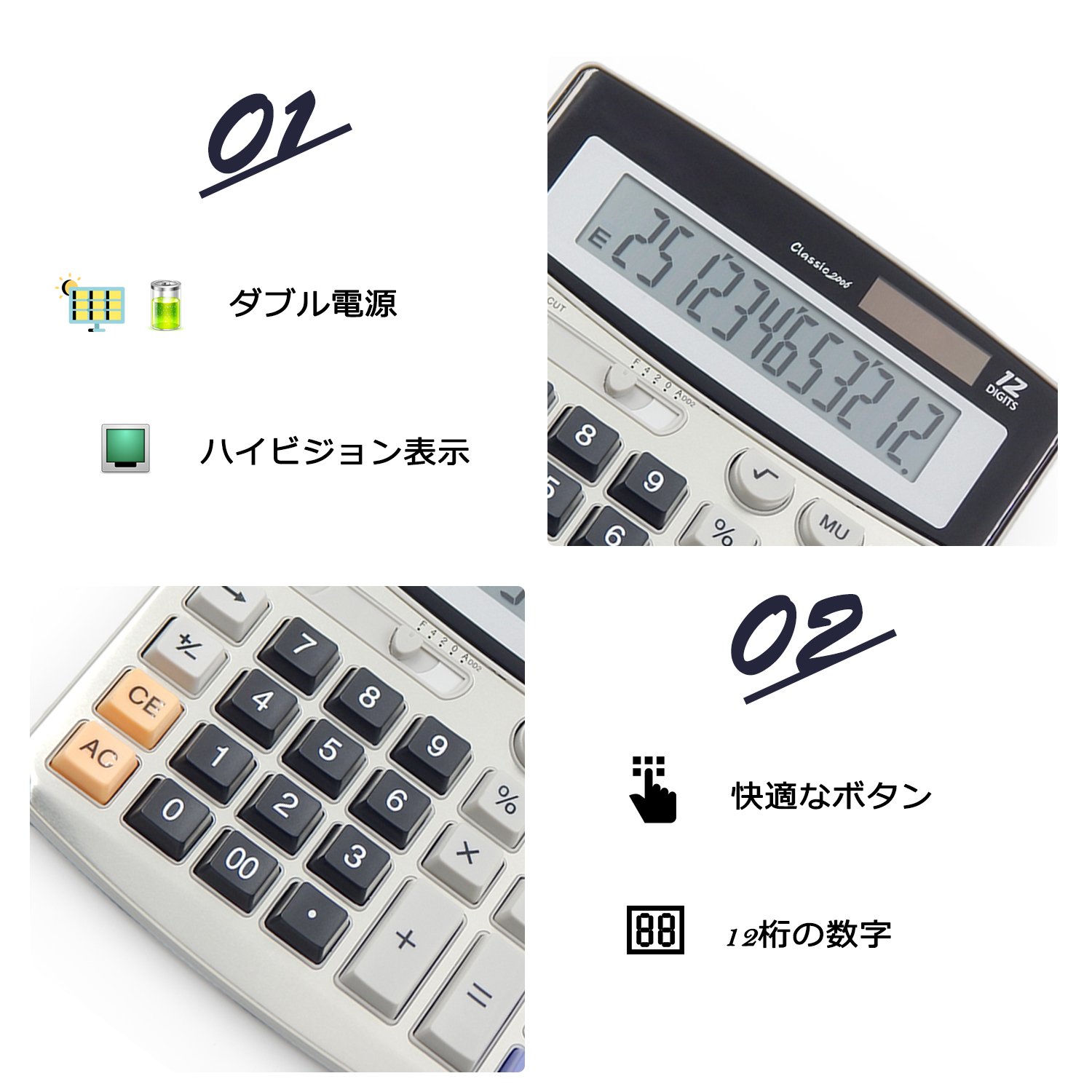 持ち運びやすい:超軽量のため、オフィスや家庭や学校などには最適です。 二重電源:ソーラーと電池式・補助電池、ソーラーのみでも明るい場所に働くできます。 機能充実:税計算や早打ちなど便利な機能も充実 快適な体験:人間工学に基づいたデザインの快適なボタンを上げまして、押すの圧力感があります。 ●サイズ:15.5 * 4.5* 16.3センチメートル ●商品を含む:1 x電卓 1 x説明書「ご注意、運送安全・安全管制のため、本製品は電池を付けない、ご理解を」