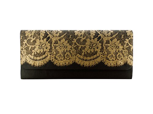 - Add some elegance to your outfit with this Ladies Clutch Bag with Lace Print, made of satiny black material with a glittery gold lace print on the flap
