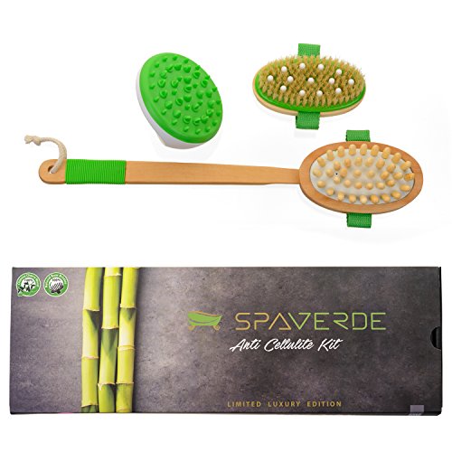 The kit contains: 1 cellulite massager brush mitt for use in the shower - 1 long detachable handle for easy use - 1 brush with wooden nubs for massaging fat pockets naturally - 1 brush with nubs and boar bristles to get the combined results of dry brushing and cellulite massaging.